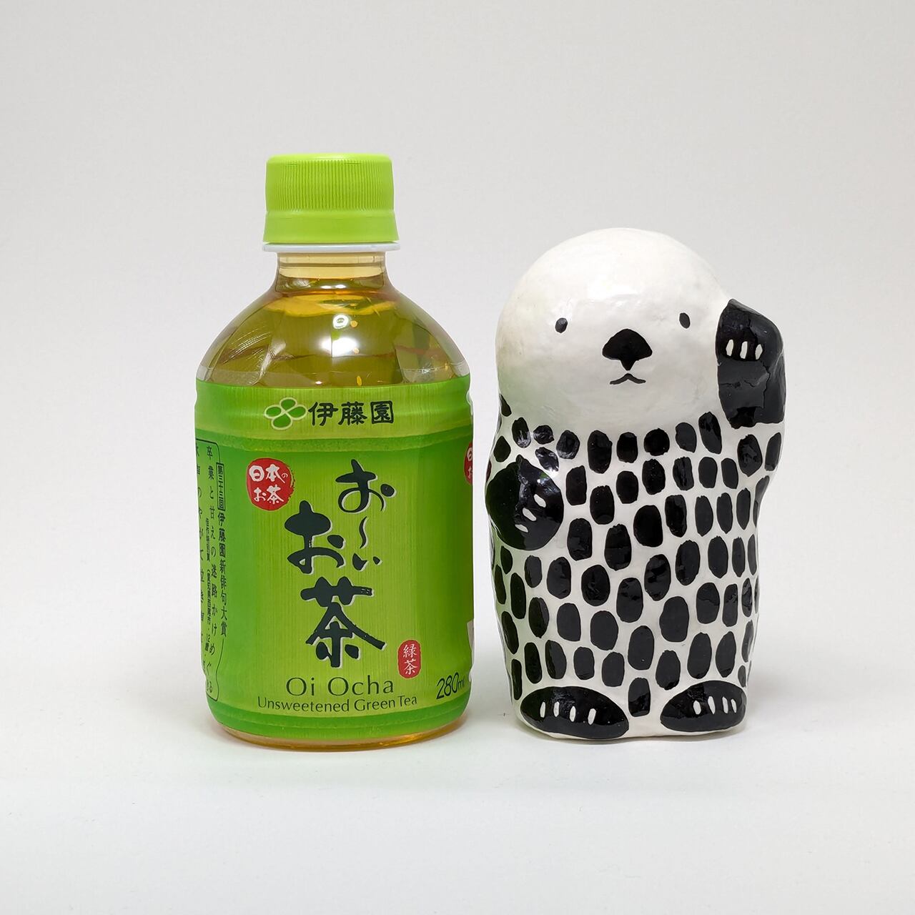 This papier-mâché sea otter imitates the beckoning cat in a pose with one arm raised in the air, which is said to bring good luck in Japan.