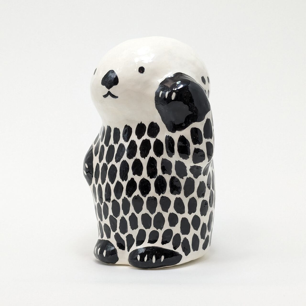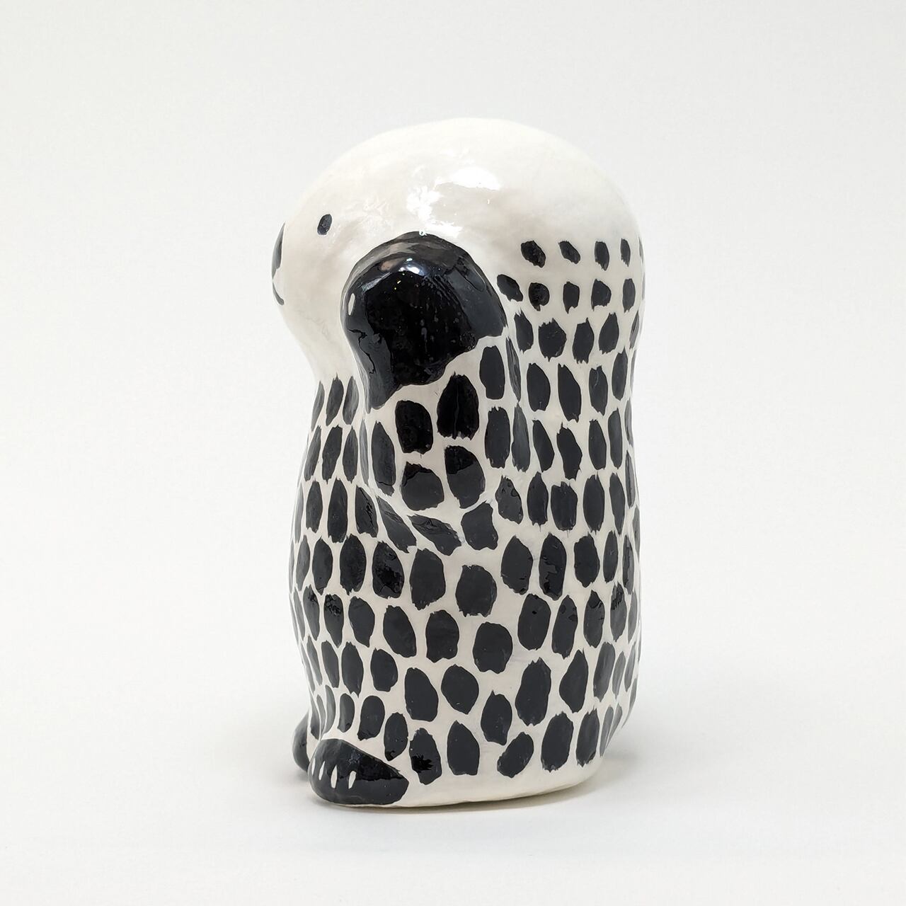 Adorable handmade sea otter papier-mâché is now available. This is a special one-of-a-kind piece, and its simple black-and-white design blends well with any interior. The size fits easily in the palm of your hand, yet has a great presence. The glossy surface attracts the viewer's eye and conveys a warm, handmade charm. Carefully crafted one by one, this papier-mâché is the perfect item to add color to your space.