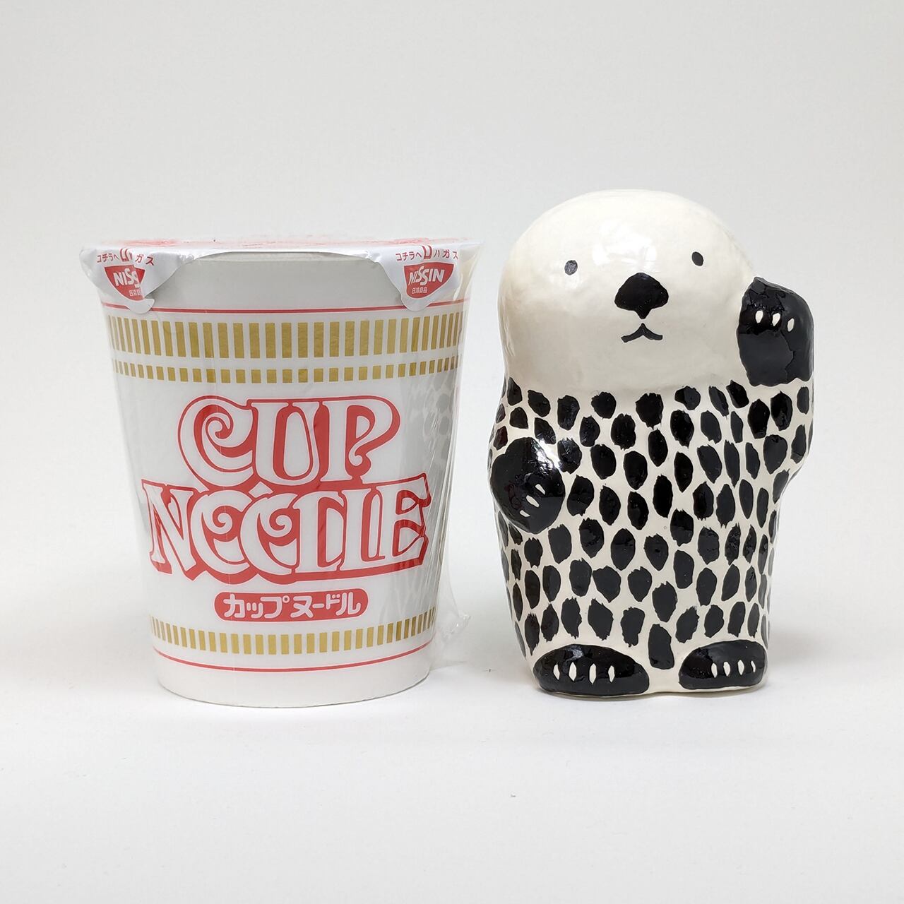 日本では幸運を招くと言われる片腕をあげて手招くポーズをした招き猫を模したラッコの張り子です。